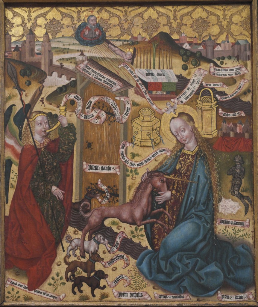 Ad ogni modo, tornando al Phisyologus, la leggenda parla dell’unicorno nei termini di un animale che si lascia prendere volontariamente e addomesticare solo da una vergine. Va da sé che nel Medioevo tale racconto si arricchì apportando una consistente complessità iconografica e quello che all’inizio fu un racconto erotico, si ritrovò poi come per incanto a veicolare l’annuncio della Carità di Dio. La stessa rappresentazione del racconto (testimoniata dagli splendidi arazzi del Metropolitan Museum of Art di New York o quelli del Museo di Cluny) va ad arricchirsi (e appesantirsi) di un’ iconografia sempre più particolareggiata. Quella del Weimar, Schlossmuseum è uno dei tanti esempi di fusione della leggenda con il racconto dell’Annunciazione: l’Arcangelo Gabriele che porta l’annuncio alla Madonna figura come un cacciatore che induce l’unicorno (Cristo) a lasciarsi catturare dalla Vergine Maria, rinchiudendosi nel suo grembo quale Hortus conclusus, trasposto nell’immagine della staccionata che delimita un giardino rigoglioso di fiori. Una volta venuto al mondo l’Unicorno diviene vulnerabile e quindi volontariamente pronto alla morte (la Passione). Tra gli elementi iconografici, i quattro cagnolini tenuti al guinzaglio da Gabriele, assumono una particolare valenza rispetto alla nostra riflessione. Ognuno di essi reca un cartiglio con su scritto in caratteri gotici: “Misericordia”, “Verità”, “Giustizia” e “Pace”: sono i doni che l’Unicorno porta con sé in quel lento processo di recupero dell’uomo decaduto, sulla scia del Salmo 85 che recita: “Misericordia e Verità si incontreranno; Giustizia e Pace si baceranno”. È in questo processo di riconciliazione tra opposti che viene a realizzarsi la salvezza, ponendo e ponendosi la domanda se esiste e quale sia il luogo della salvezza, oggi, nel nostro tempo, nella nostra vita; il locus dove poter trovare la completa armonia tra Verità, Misericordia, Giustizia e Pace.